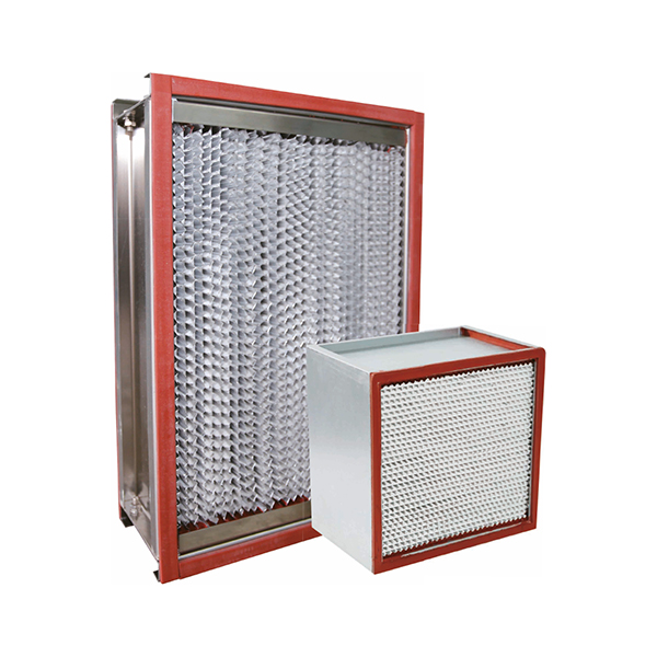 耐高溫高效過濾器采用有隔板結構,使用超細、、耐高溫高效玻纖濾紙作為濾料,波浪形鋁箔作分隔板,配以金屬外框和進口特制耐高溫密封膠密封制成。其阻力低,效率高,耐溫性能好,適應于150-350℃環(huán)境下長期使用。
